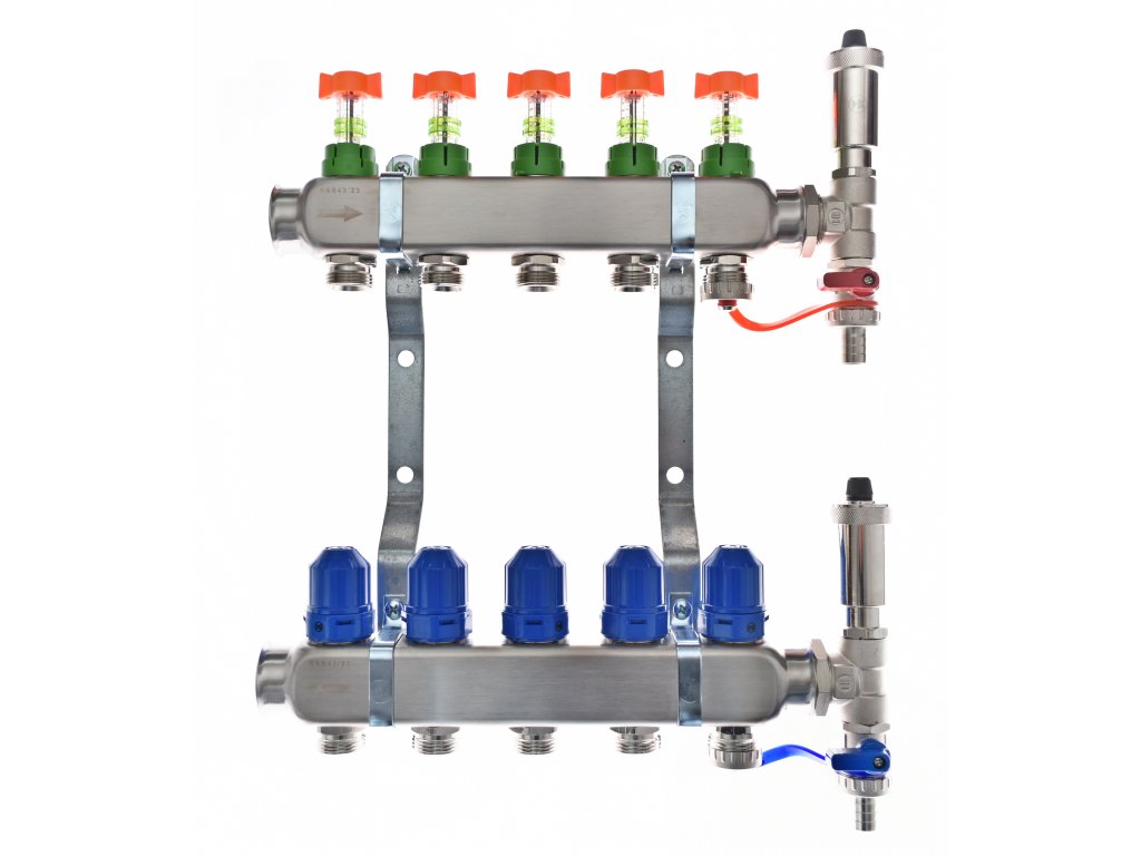 Vybavený rozdělovač průtokoměry je určen pro regulaci průtoku a teploty vstupní vody do podlahového vytápění. Automatický odvzdušňovací ventil slouží k samostatnému plně automatickému odvzdušnění soustavy vytápění.